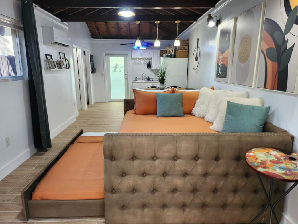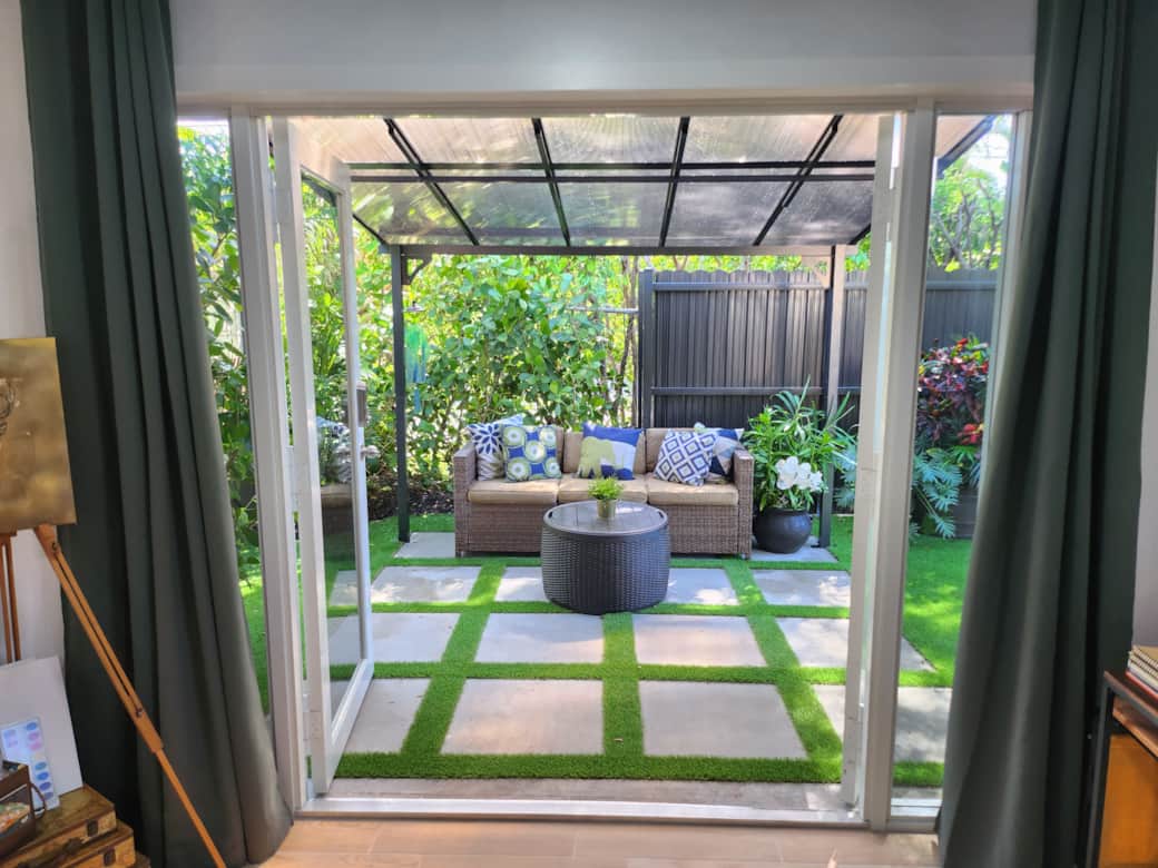 There is an alley between two houses. That's the way to go to The Atelier. Guests will find a wood door on the left side of the alley with a blue plaque that reads The Atelier.